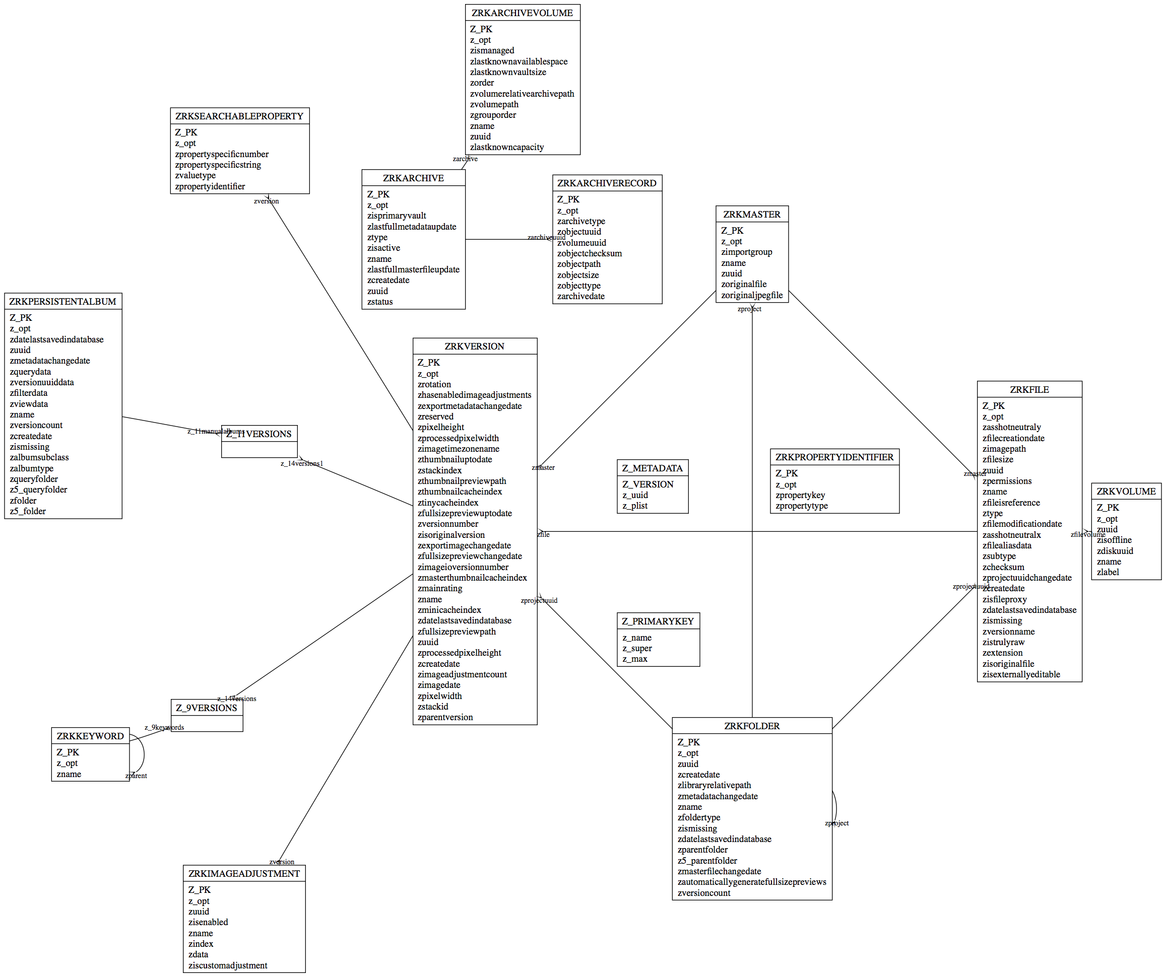ormag ~/Pictures/Aperture Library.aplibrary/Aperture.aplib>sqlite3 Library.apdb SQLite version 3.1.3 Enter ".help" for instructions sqlite> .tables ZRKARCHIVE ZRKIMAGEADJUSTMENT ZRKVERSION ZRKARCHIVERECORD ZRKMASTER Z_10VERSIONS ZRKARCHIVEVOLUME ZRKPERSISTENTALBUM Z_METADATA ZRKFILE ZRKPROPERTYIDENTIFIER Z_PRIMARYKEY ZRKFOLDER ZRKSEARCHABLEPROPERTY sqlite> .schema z_metadata ormag ~/Pictures/Aperture Library.aplibrary/Aperture.aplib>sqlite3 Library.apdb SQLite version 3.3.7 Enter ".help" for instructions sqlite> .tables ZRKARCHIVE ZRKKEYWORD ZRKVOLUME ZRKARCHIVERECORD ZRKMASTER Z_11VERSIONS ZRKARCHIVEVOLUME ZRKPERSISTENTALBUM Z_9VERSIONS ZRKFILE ZRKPROPERTYIDENTIFIER Z_METADATA ZRKFOLDER ZRKSEARCHABLEPROPERTY Z_PRIMARYKEY ZRKIMAGEADJUSTMENT ZRKVERSION sqlite> .schema zrkfile CREATE TABLE ZRKFILE ( Z_ENT INTEGER, Z_PK INTEGER PRIMARY KEY, Z_OPT INTEGER, ZASSHOTNEUTRALY FLOAT, ZFILECREATIONDATE TIMESTAMP, ZIMAGEPATH VARCHAR, ZFILESIZE INTEGER, ZUUID VARCHAR, ZPERMISSIONS INTEGER, ZNAME VARCHAR, ZFILEISREFERENCE INTEGER, ZTYPE VARCHAR, ZFILEMODIFICATIONDATE TIMESTAMP, ZASSHOTNEUTRALX FLOAT, ZFILEALIASDATA BLOB, ZSUBTYPE VARCHAR, ZCHECKSUM VARCHAR, ZPROJECTUUIDCHANGEDATE TIMESTAMP, ZCREATEDATE TIMESTAMP, ZISFILEPROXY INTEGER, ZDATELASTSAVEDINDATABASE TIMESTAMP, ZISMISSING INTEGER, ZVERSIONNAME VARCHAR, ZISTRULYRAW INTEGER, ZPROJECTUUID VARCHAR, ZEXTENSION VARCHAR, ZISORIGINALFILE INTEGER, ZISEXTERNALLYEDITABLE INTEGER, ZFILEVOLUME INTEGER, ZMASTER INTEGER ); CREATE INDEX ZRKFILE_ZCHECKSUM_INDEX ON ZRKFILE (ZCHECKSUM); CREATE INDEX ZRKFILE_ZCREATEDATE_INDEX ON ZRKFILE (ZCREATEDATE); CREATE INDEX ZRKFILE_ZFILECREATIONDATE_INDEX ON ZRKFILE (ZFILECREATIONDATE); CREATE INDEX ZRKFILE_ZFILEMODIFICATIONDATE_INDEX ON ZRKFILE (ZFILEMODIFICATIONDATE); CREATE INDEX ZRKFILE_ZFILESIZE_INDEX ON ZRKFILE (ZFILESIZE); CREATE INDEX ZRKFILE_ZFILEVOLUME_INDEX ON ZRKFILE (ZFILEVOLUME); CREATE INDEX ZRKFILE_ZISEXTERNALLYEDITABLE_INDEX ON ZRKFILE (ZISEXTERNALLYEDITABLE); CREATE INDEX ZRKFILE_ZMASTER_INDEX ON ZRKFILE (ZMASTER); CREATE INDEX ZRKFILE_ZNAME_INDEX ON ZRKFILE (ZNAME); CREATE INDEX ZRKFILE_ZPROJECTUUIDCHANGEDATE_INDEX ON ZRKFILE (ZPROJECTUUIDCHANGEDATE); CREATE INDEX ZRKFILE_ZUUID_INDEX ON ZRKFILE (ZUUID); sqlite> .schema z_metadata CREATE TABLE Z_METADATA (Z_VERSION INTEGER PRIMARY KEY, Z_UUID VARCHAR(255), Z_PLIST BLOB); sqlite> .schema z_primarykey CREATE TABLE Z_PRIMARYKEY (Z_ENT INTEGER PRIMARY KEY, Z_NAME VARCHAR, Z_SUPER INTEGER, Z_MAX INTEGER); sqlite> select * from z_primarykey; 1|RKArchive|0|1 2|RKArchiveRecord|0|0 3|RKArchiveVolume|0|1 4|RKFile|0|2604 5|RKFolder|0|23 6|RKProject|5|0 7|RKProjectSubfolder|5|0 8|RKImageAdjustment|0|1086 9|RKKeyword|0|758 10|RKMaster|0|2604 11|RKPersistentAlbum|0|99 12|RKPropertyIdentifier|0|119 13|RKSearchableProperty|0|84191 14|RKVersion|0|2606 15|RKVolume|0|0 sqlite>